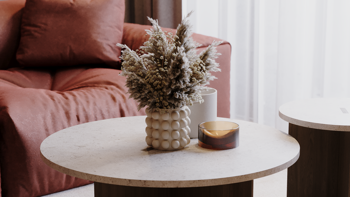 The final project for 2023, is as magical as the season in which it was created - Christmas. The space is divided into a living area and a kitchen with a dining area, with the fireplace serving as the centrepiece and divider of the entire space. The beautiful French doors and windows are accented with the Callacata Viola marble as the fireplace. The palette is calm to balance the different materials. Venetian plaster, classic mouldings in a modern, luxurious eclectic interior style.